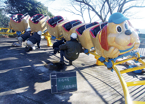たくさんのお客様がご利用する遊園地遊具設備の点検を行っています。